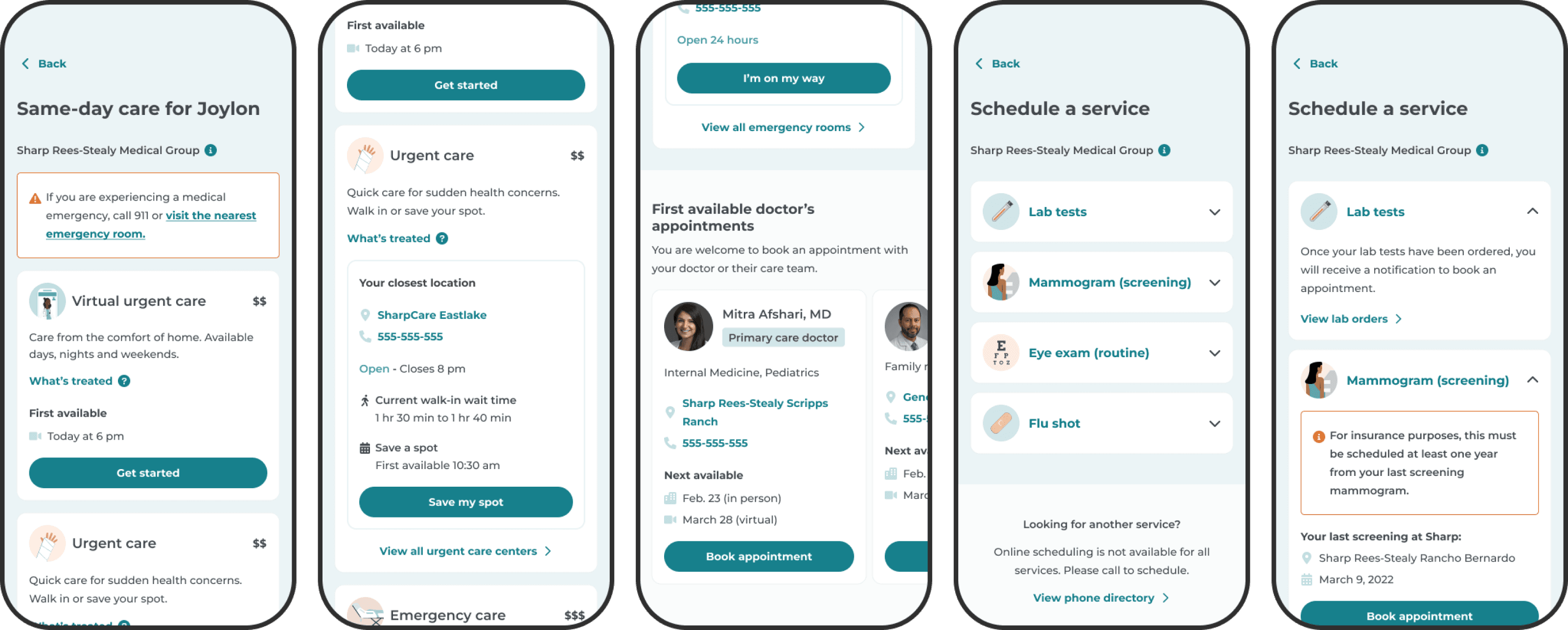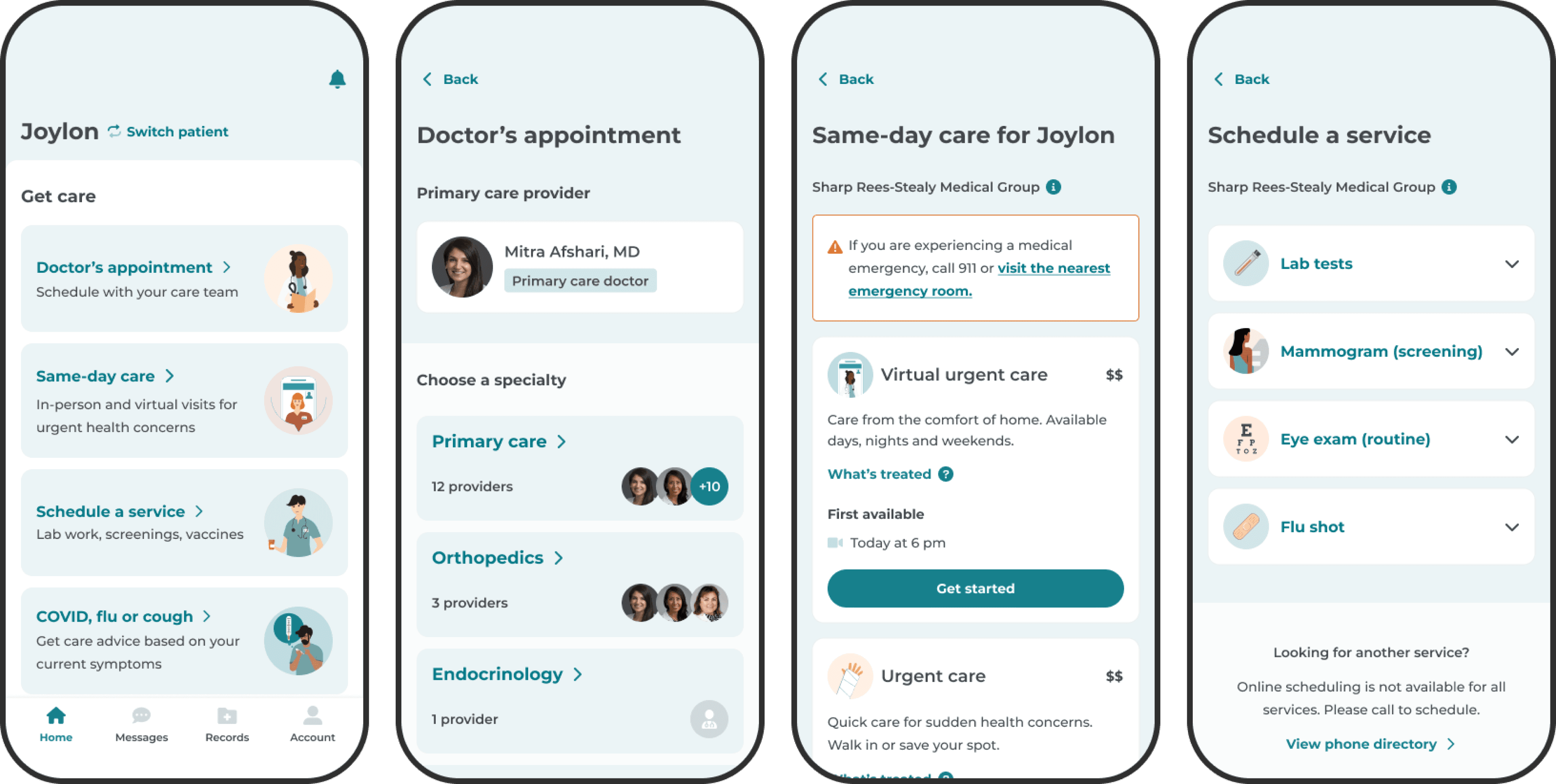 When making appointments, users first saw doctors and specialties they'd already established as their care team. The app then showed only in-network doctors connected to their care team or patient medical group affiliations. For finding new doctors, the app opened Sharp.com in a browser view.