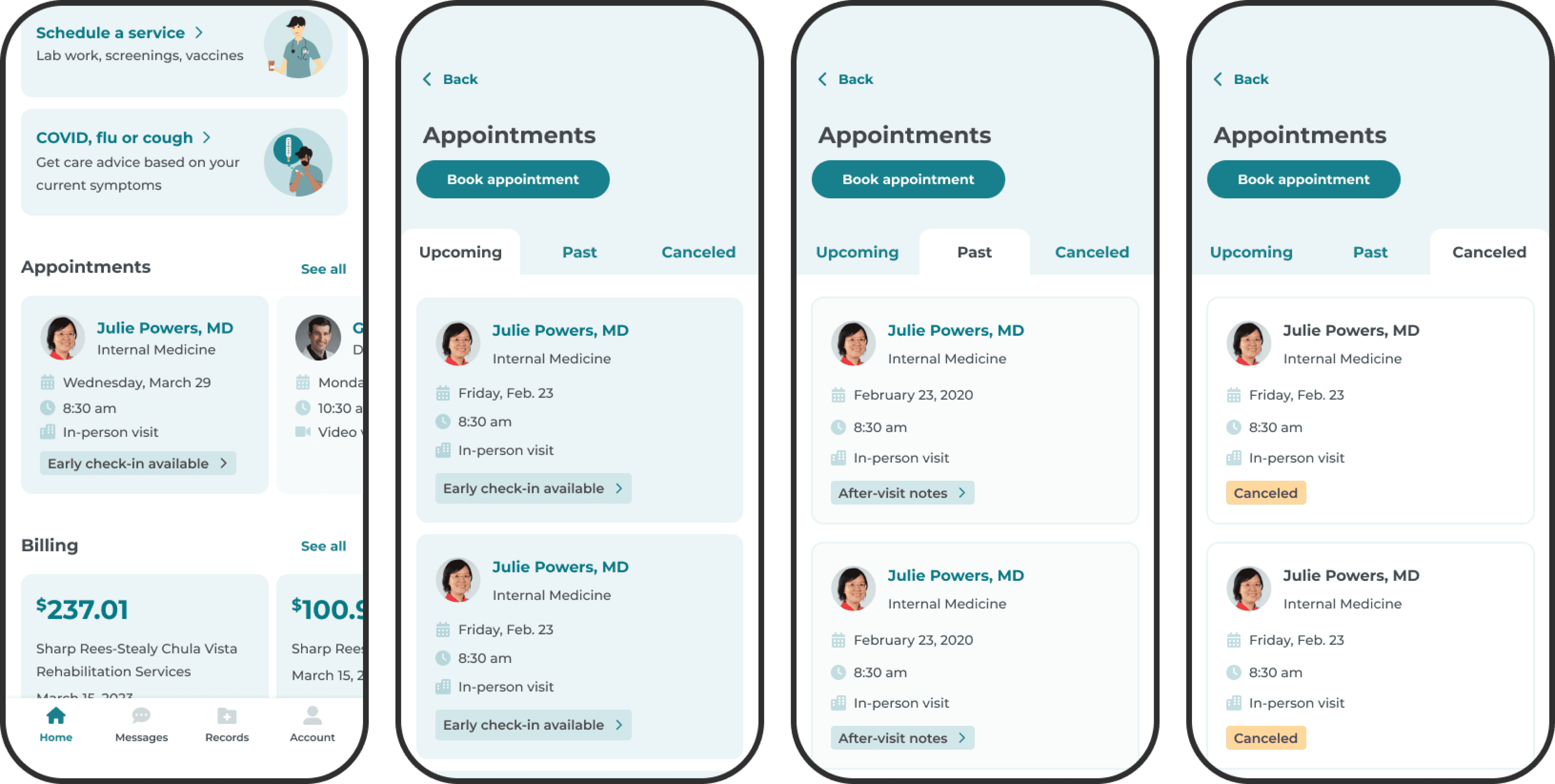To enable provider-patient relationship building, I included features for messaging care teams and centralized appointment oversight. Messaging was a core navigation option. Patients could access upcoming, past, and canceled appointments from the home screen.